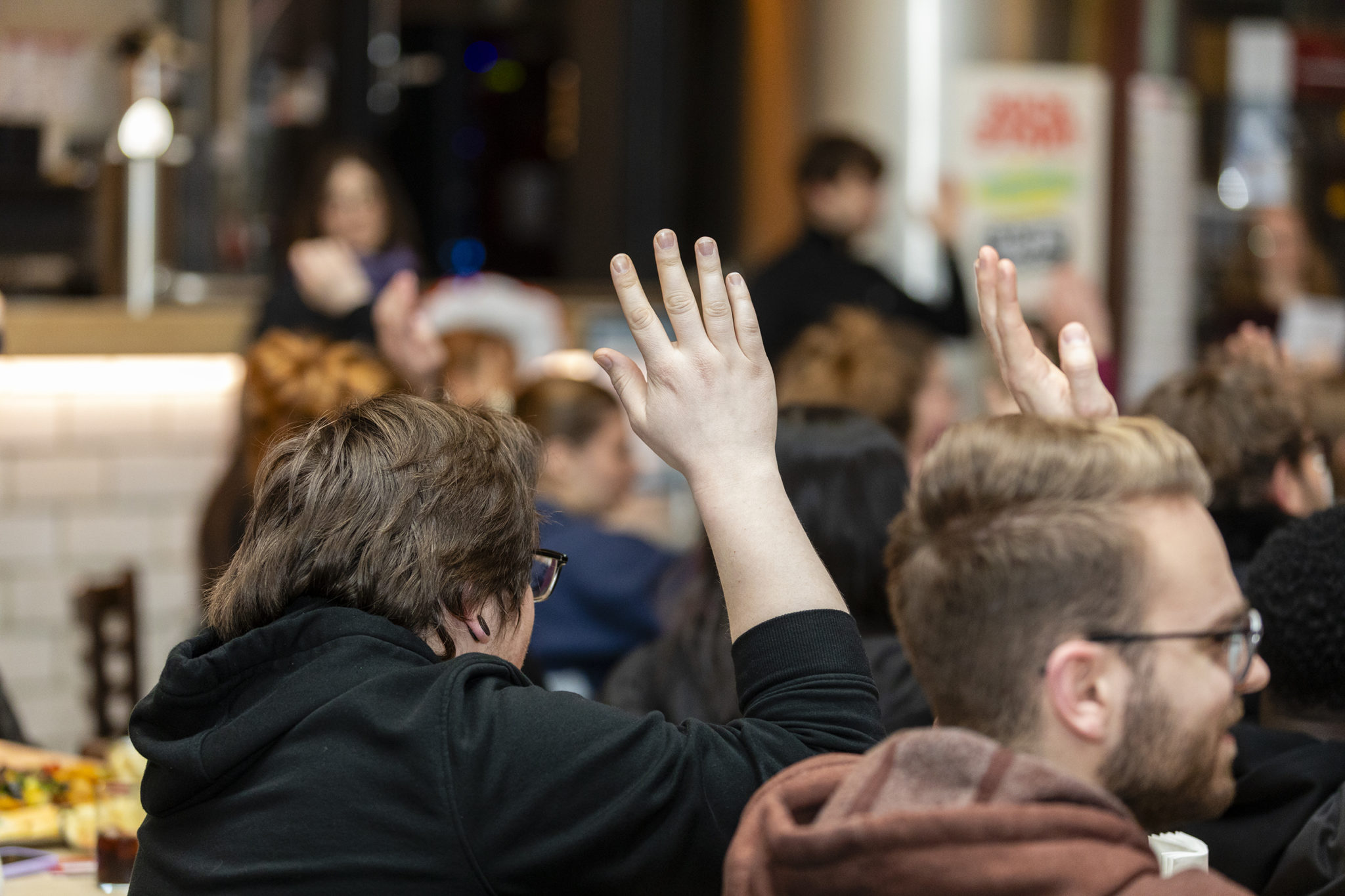 (Symbolbilder von der Veranstaltung „Lass uns Reden“ zur Bundestagswahl 2025. Fotoquelle/Hinweis: Merle Forchmann/Jugendring Düsseldorf