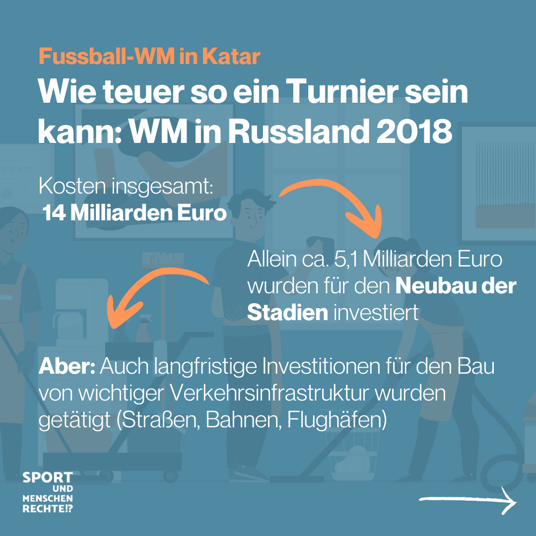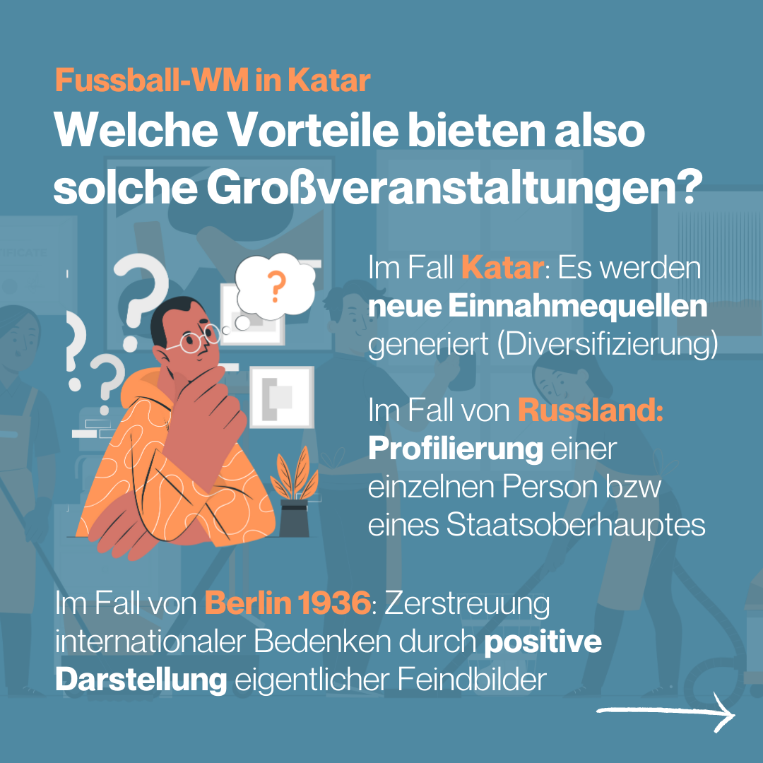 Die letzte WM in Russland 2018 hat geschätzt 14 Milliarden Dollar (10-11 Milliarden Euro) gekostet. Gleichzeitig können unmittelbare Gewinne schwierig ermittelt werden. Also müssen auch andere Faktoren bei der Bewerbung für ein Großsportereignis eine Rolle spielen. Es fällt auf, dass in den letzten Jahren solche Turniere und Events zunehmend an Länder vergeben wurden, deren politische Systeme nicht vollends unseren demokratischen Grundwerten entsprechen.